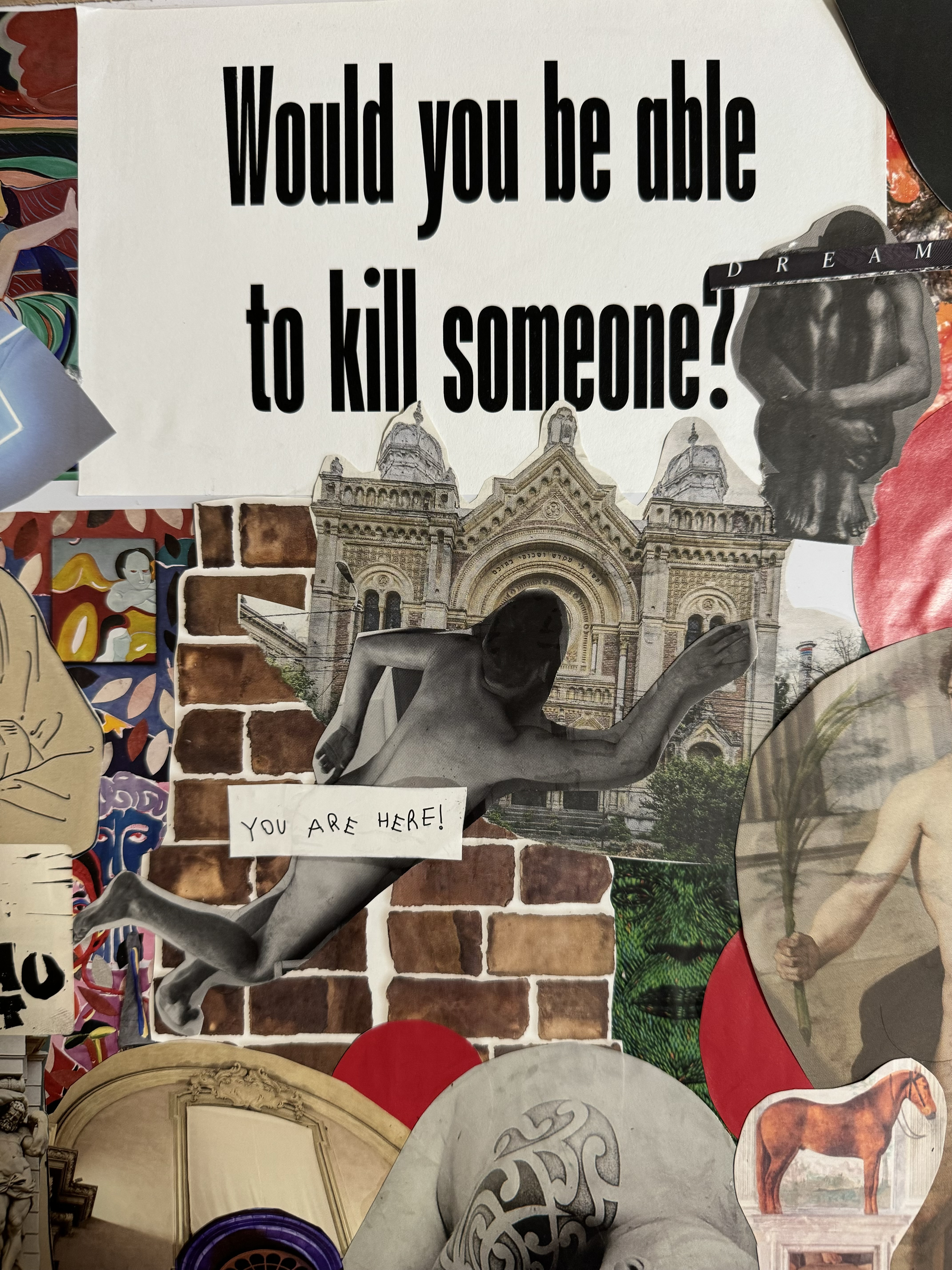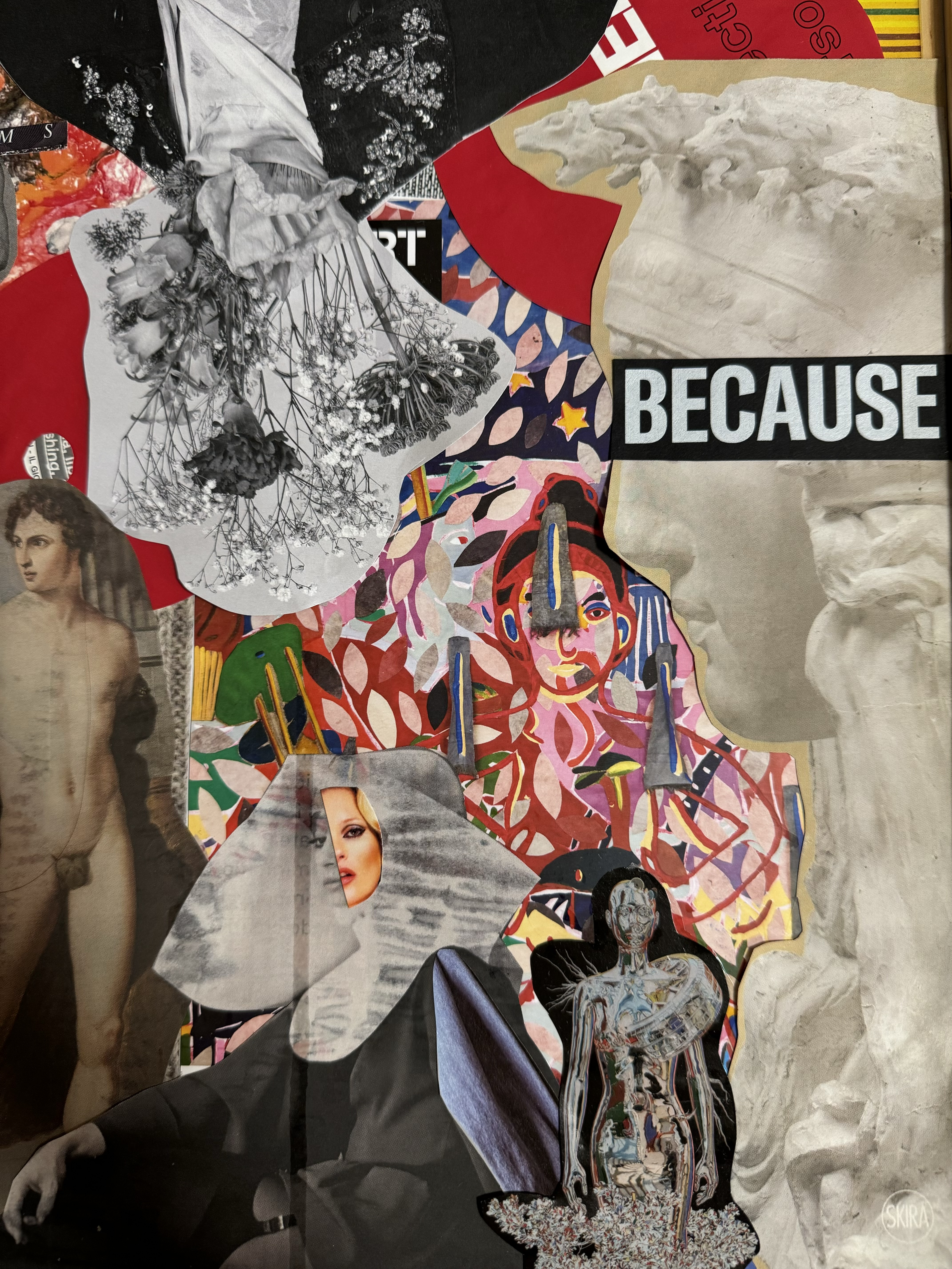 Fragments of Freedom is a collage that shows the struggles of Iranian women under strict limits on their freedom and identity. Made from brochures and images collected at the Bologna Art Fair, this artwork criticizes Iran’s social and political situation, with the hijab symbolizing control over women. Classical sculptures alongside modern images highlight the clash between Iran’s history and today’s restrictions. The fragmented style reflects the broken reality of life under oppression, linking the fight for women’s rights in Iran to global human rights issues. This piece calls for support of their resilience and the universal need for freedom and dignity.